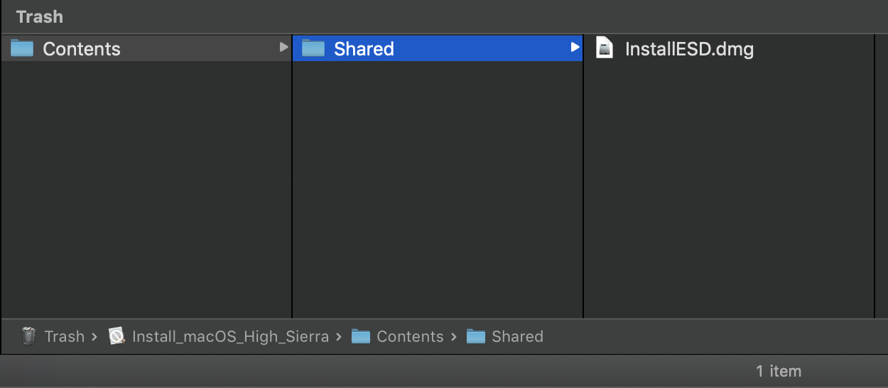 However there is one remaining and I can't delete it. I have tried everything that has been said. It says the item is in use, but if you look at the attached image it is an installer app that has a .dmg remaining inside.