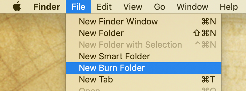 - Your burner must be plugged in and powered up for the New Burn Folder option to be visible in the Finder File menu.