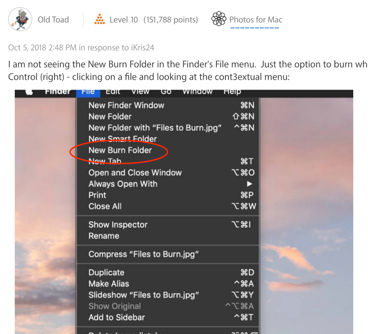- A work-around is to create a burn folder in Finder by clicking on File > New Burn Folder