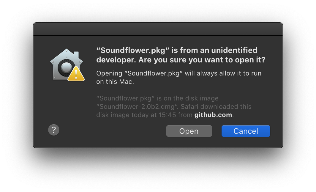 you may see a warning saying - "an attempt to install 'soundflower' by 3rd party developer was blocked"