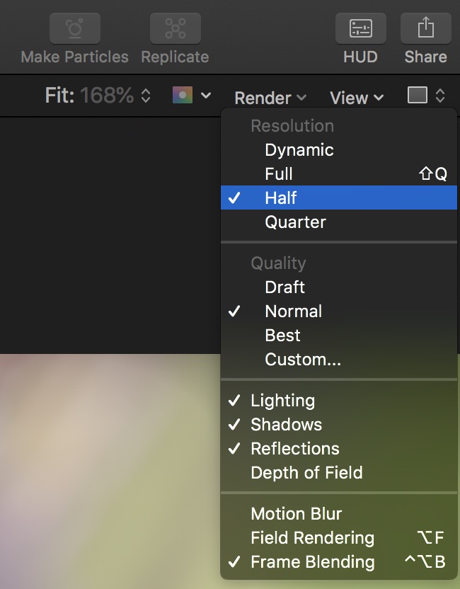 In any case, it usually doesn't take a terribly long time for Motion to Render a project. This one is a little too long for 24GB RAM Preview (at least at the default Preference setting of 80%), but rendering out as a ProRes (Proxy) mov for preview doesn't make that much difference in time and will provide you with an accurate visual feedback. Just keep rewriting over the same mov file for whatever project you're working on, like it's part of the application. [PS - ProRes Proxy is *not* the same thing as proxy files in Final Cut Pro. Proxy in FCPX is 1/4 resolution ProRes 422. ProRes Proxy is full resolution with greater compression than any of the other versions.]
