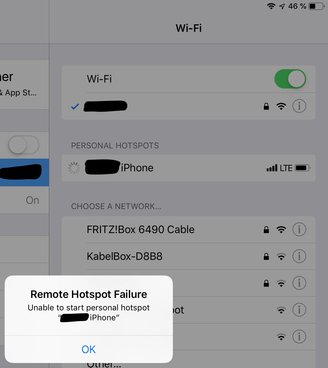 I am attempting to use the iPhone as the Hotspot. I cannot get the Instant Hotspot to connect from the iPad with iOS 12.1.4. This was working very will with iOS 10 between these two devices. The iPhone does list in the 'Personal Hotspots' area of the Wi-Fi settings. If I turn the Hotspot on on the iPhone manually then attempt to connect to it from the iPad, I will still get the "Unable to start personal hotspot" failure message. Once I tap the 'Ok' button, the iPad the connects fine.