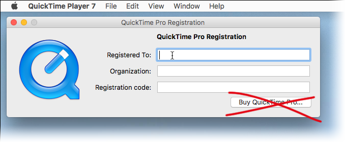 2. I went to the Quicktime 7 menu, clicked on Registration, and entered into the registration window the exact same registration name and code that are in my email from years ago. I then clicked on the Buy button.