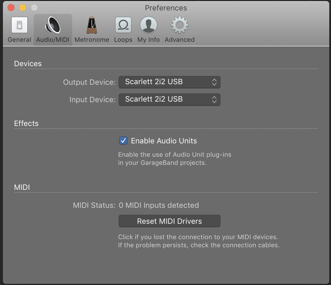 When I create a new track in garage band I can select both the Focusrite interface and the computers internal microphone, but when I play there is no input being detected by Garageband. The volume slider on the track header does not show any input and recording produces no input also.