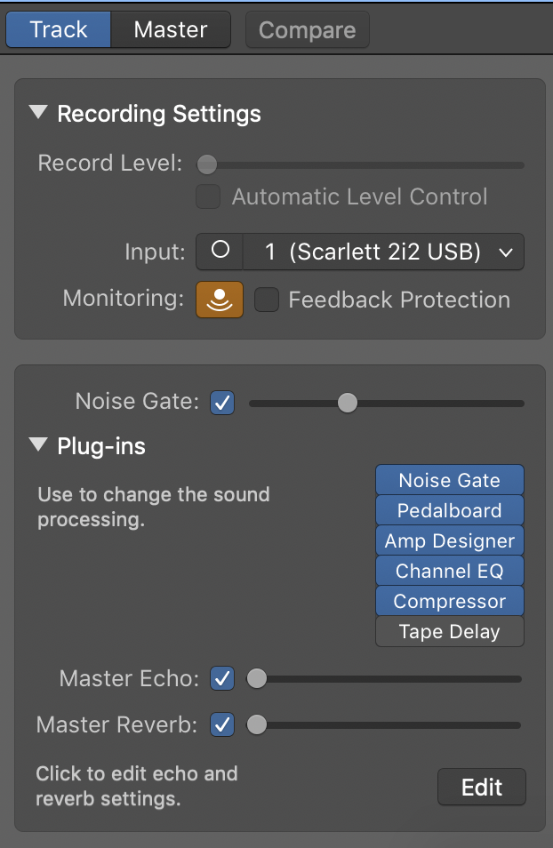 I am using a 2017 iMac running MacOS Mojave 10.14 with Garage Band 10.3.1