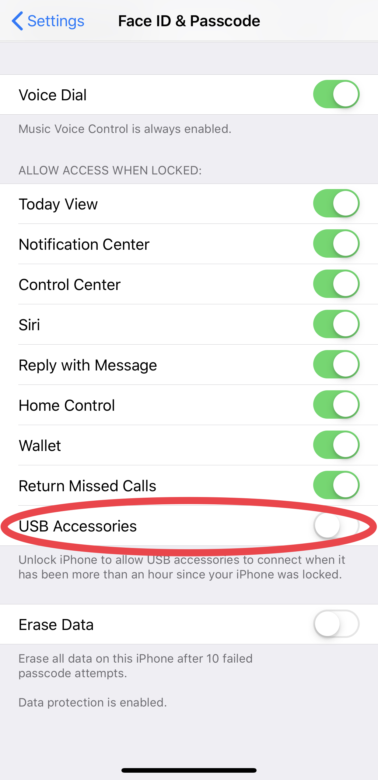 Settings -> FaceID & Passcode (or TouchID & Passcode, whichever is applicable) -> Allow Access When Locked: USB Accessories