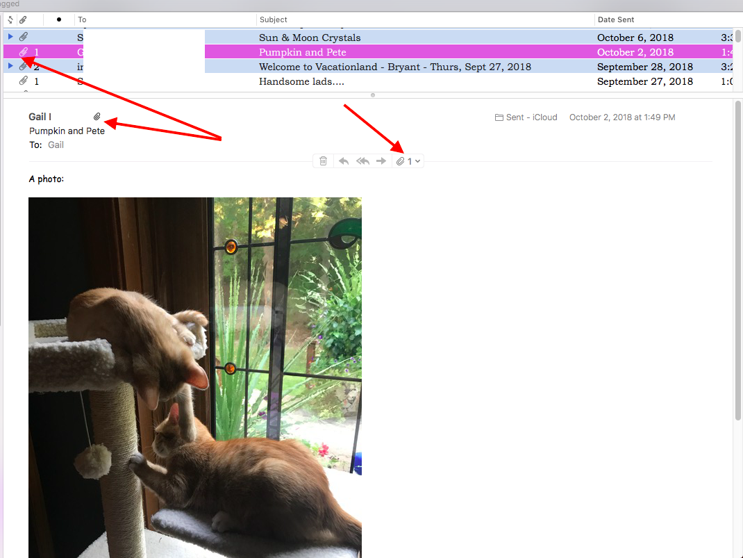 This first photo shows you the three places where it indicates that there is an attachment for this email. The bar in the middle only becomes visible when you scroll over that area with your cursor: