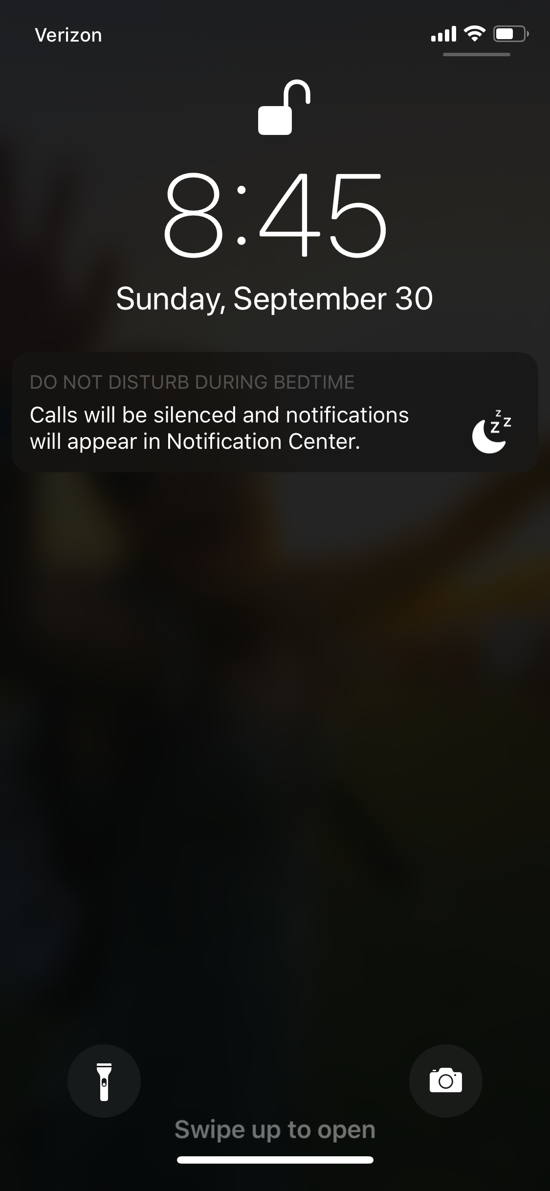 On iOS 12, when Do Not Disturb during Bedtime is enabled, once the scheduled time begins a notification that DND is active shows on the lock screen, and the lock screen is dimmed.