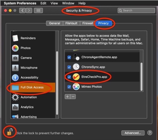 Before running Etrecheck also assign Full Disk Access to Etrecheck so that it can get additional information from the Console and log files for the report: