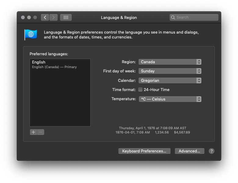 When I reopen the Language & Region pref pane or read the pref with the defaults command, it appears as though the preference has been applied, like it did with previous versions of macOS. The pref pane displays the correct locale and the correctly localized dates and times. The defaults read command returns fr_CA. However, the menu bar clock and all apps that use locales (calendar, finder, etc…) are still in en_CA. Logging out/in and rebooting don't seem to change anything.