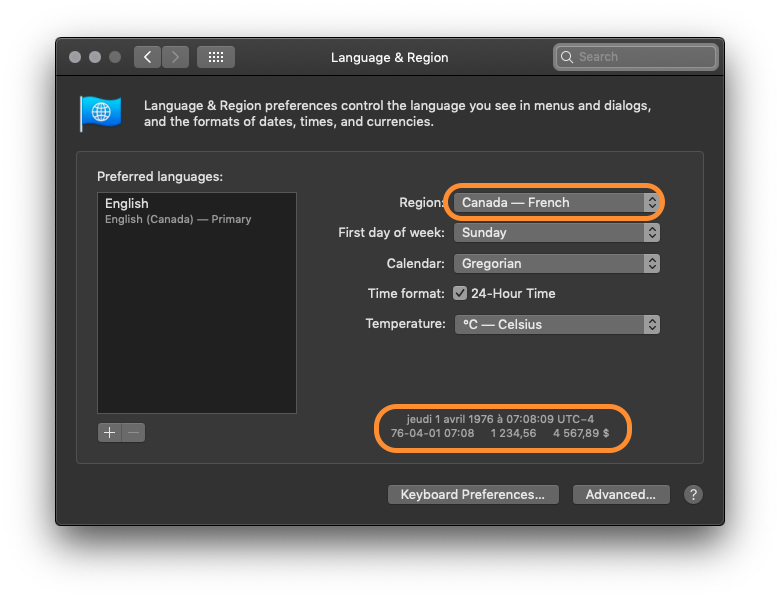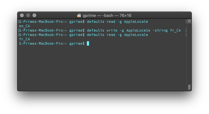 defaults write NSGlobalDomain AppleLocale -string fr_CA