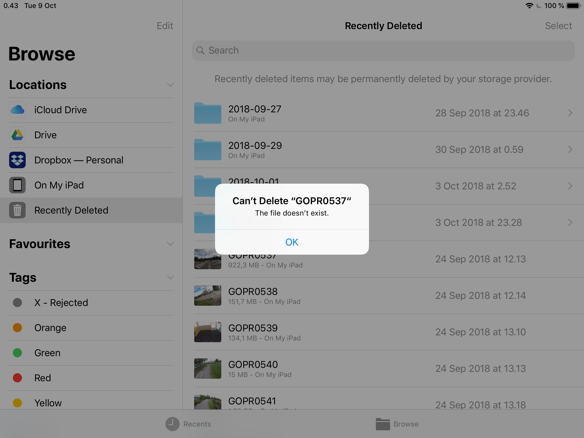 Once I no longer need the video files, I delete them (with the Files app) and they are moved to the "Recently Deleted" location. Naturally they still take up space on the device, so I want to permanently delete them. Lets say I choose all the files in the "Recently Deleted" location and permanently delete them, the following happens: