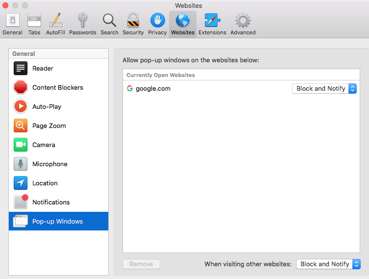 Safari > Preferences > Websites > Pop-up windows