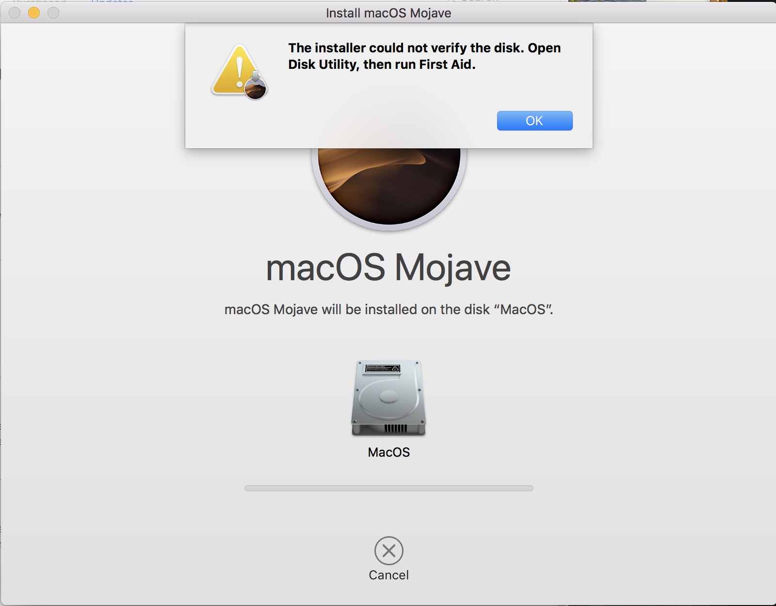 I have a problem with Mojave installation: system dialog says me, that "The installer could not verify the disk. Open Disk Utility, then run First Aid."