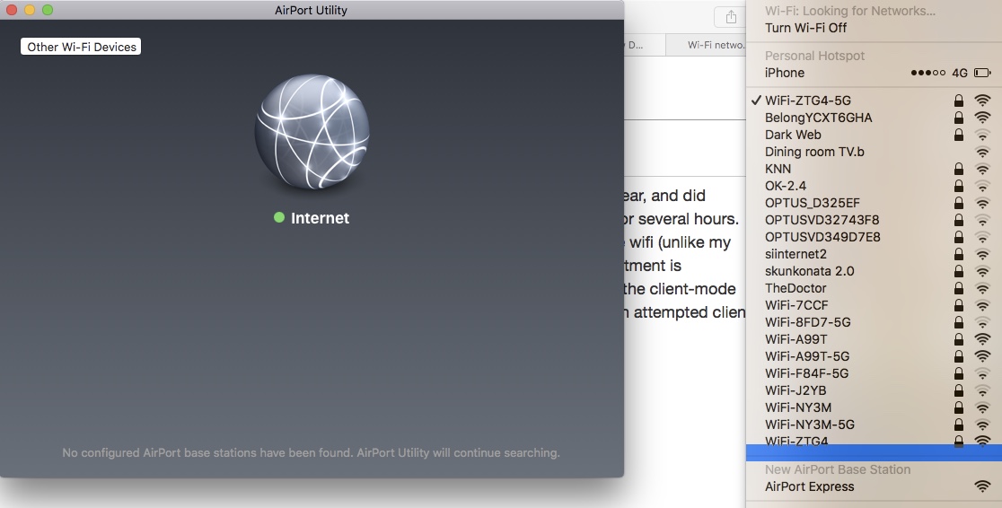 I'm having difficulty restoring AE to client mode, using "add to existing network" in the AE utility, version 638.9. I purchased the AE this year, and got it to stream iTunes music. A week ago the wifi modem was accidentally turned off for several hours. The modem was subsequently powered up successfully, but the AE would not auto-connect to the wifi (unlike my AppleTV). The AE's LED status has since been displaying a slow blink. The wifi signal throughout my small apartment is excellent. I also have no AE main base station. I've read the relevant support notes and guides; followed the client-mode set-up instructions, to no avail. I've reset the AE numerous times, also returned it to factory default, then attempted client set-up, again to no avail. Am I missing something? Any solutions? Here are some relevant screen shots, approximately in sequential order: