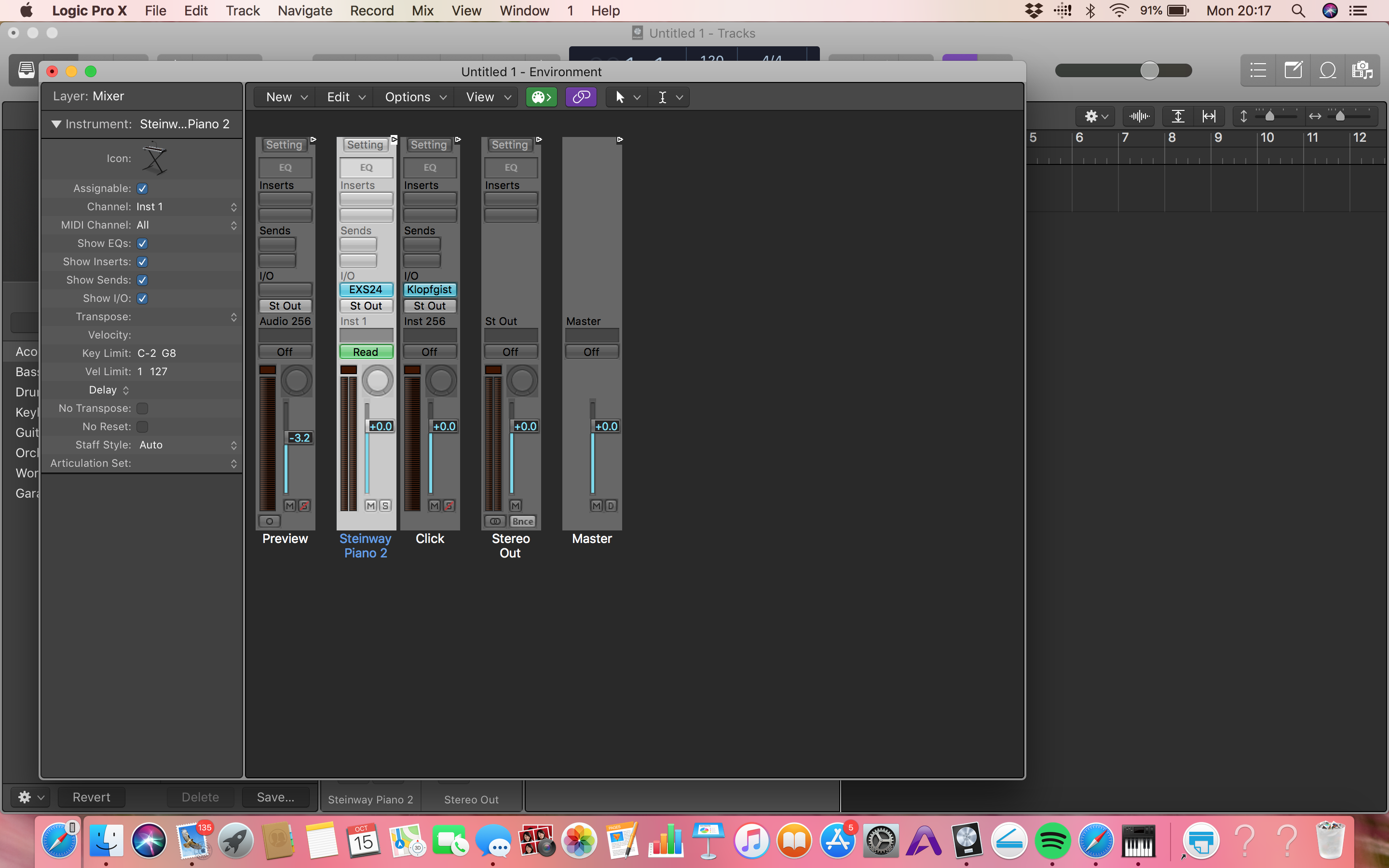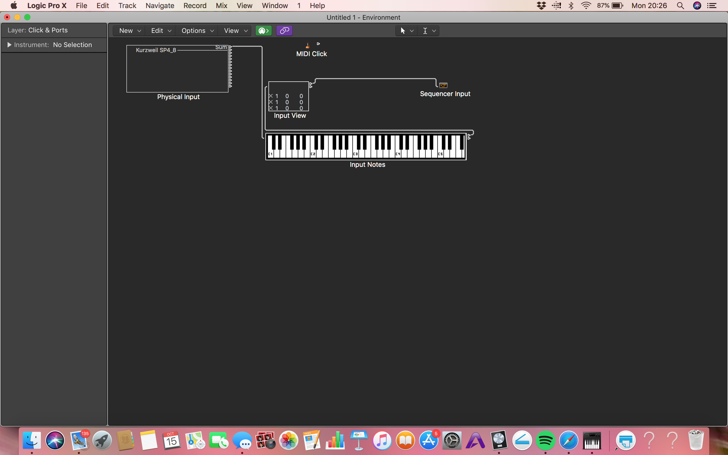 There is no issue with the virtual cable connections and your keyboard is recognized as a physical MIDI input in the Environment. So, it should work.