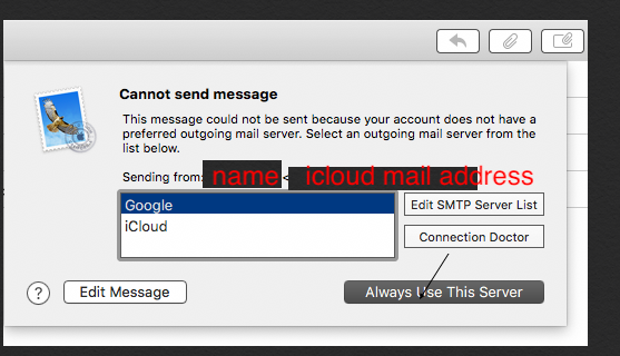 If your iCloud account is not connected ( just an example ) , open mail application click on I cloud and send a mail from - iCloud address ( in To - field type your gmail address ) the mail will be sent to your inbox in your apple mail application a pop up appears .in this screen shot it is showing could not connect to outgoing server , thats the reason when connection doctor is opened SMTP for iCloud is totally vanished .You can apply same with gmail say if IMAP or SMTP is not working . Simply click on always use this server to get joined .