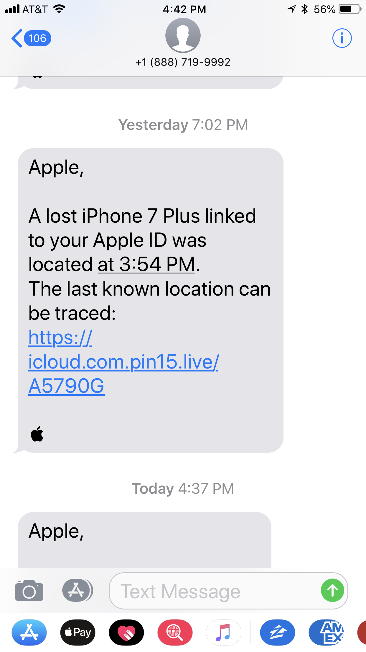 I got multiple texts allegedly from Apple saying my lost iPhone had been used. The URL it directs me to is https://icloud.com.pin15.live/A5790G which seems suspect and possibly a phishing scam. It asks me to sign in with my Apple ID and password.