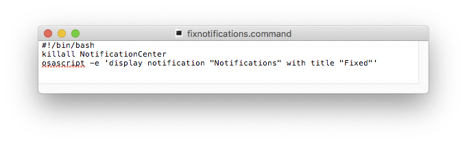 Now save the resulting file to your desktop (or wherever else you might prefer), and call it e.g. "fixnotifications.command". – Obviously, you may choose whatever name you desire, but you have to use ".command" as the file extension.
