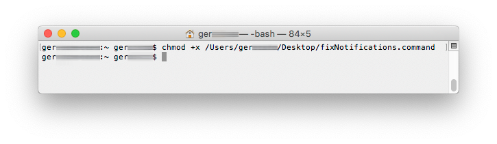 - Now the terminal should look similar to "chmod +x /Users/YourUsername/Desktop/fixnotifications.command"