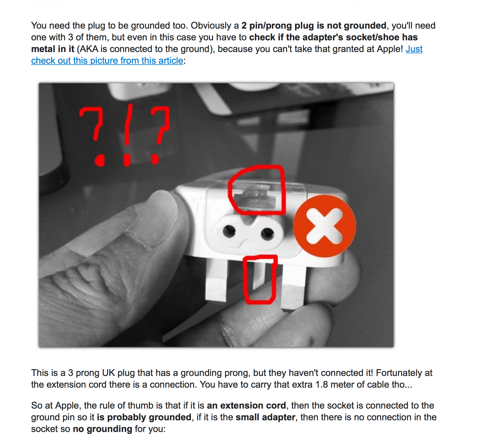 Purchase this macbook for a month and tolerating the tingling and electrical feeling from the macbook thinking is a norm. But this effect is getting so disturbing, goggling around for solution but nothing works. Calling apple support to explain the situation and was told is acceptable by international standard. Then I start to look at the grounding of the cable of the three pin plug and comparing it with the old macbook. That's what I found. No grounding pin ??? This is a norm ? Kidding me apple ?