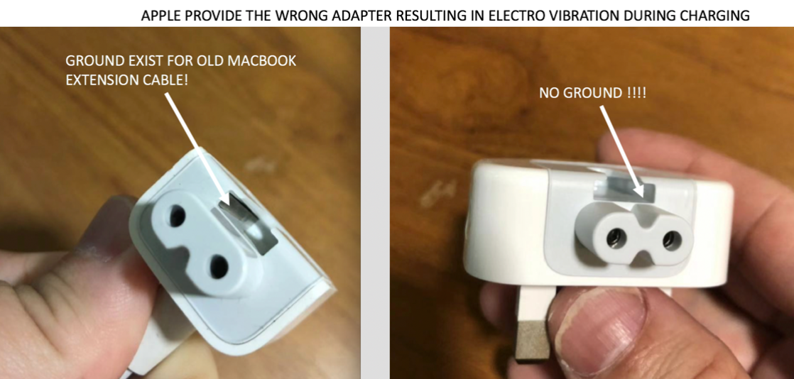 Purchase this macbook for a month and tolerating the tingling and electrical feeling from the macbook thinking is a norm. But this effect is getting so disturbing, goggling around for solution but nothing works. Calling apple support to explain the situation and was told is acceptable by international standard. Then I start to look at the grounding of the cable of the three pin plug and comparing it with the old macbook. That's what I found. No grounding pin ??? This is a norm ? Kidding me apple ?