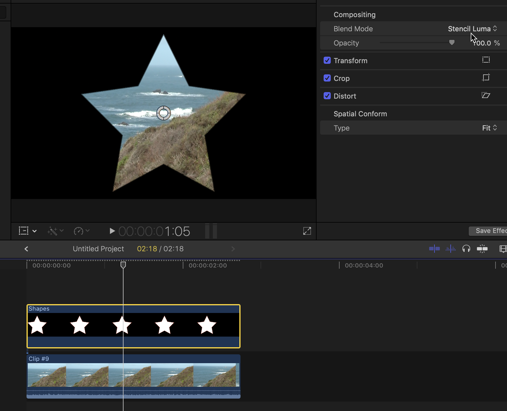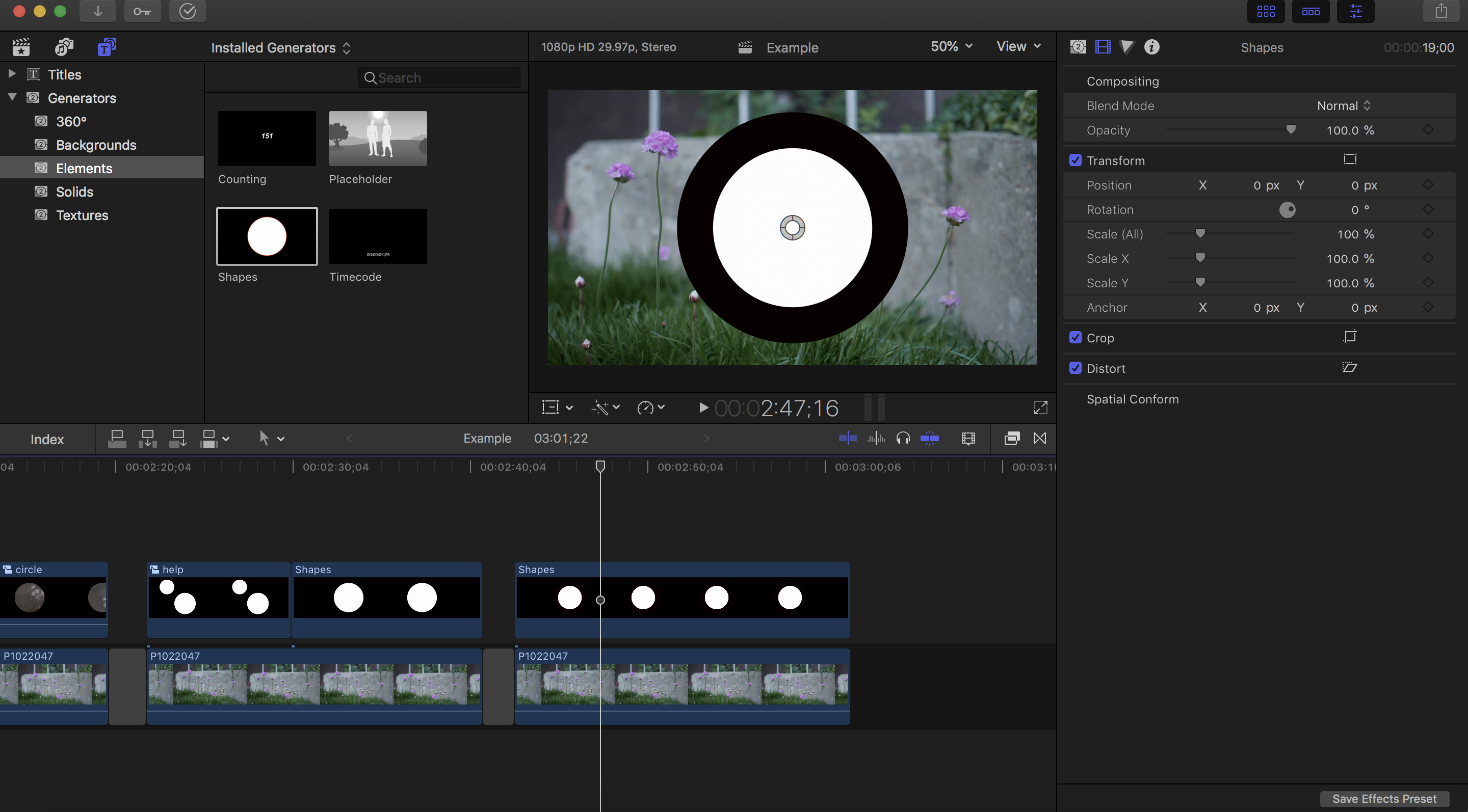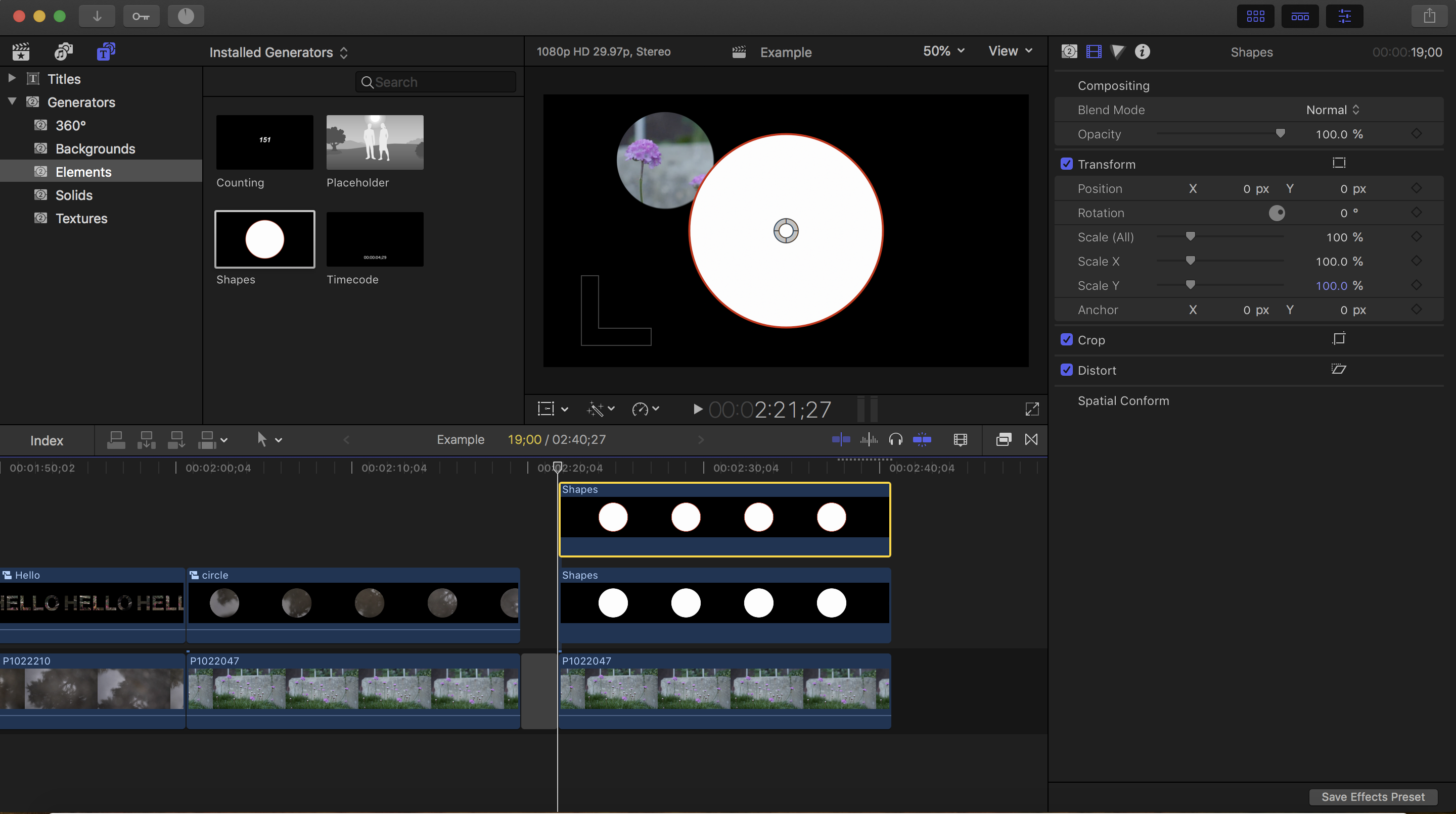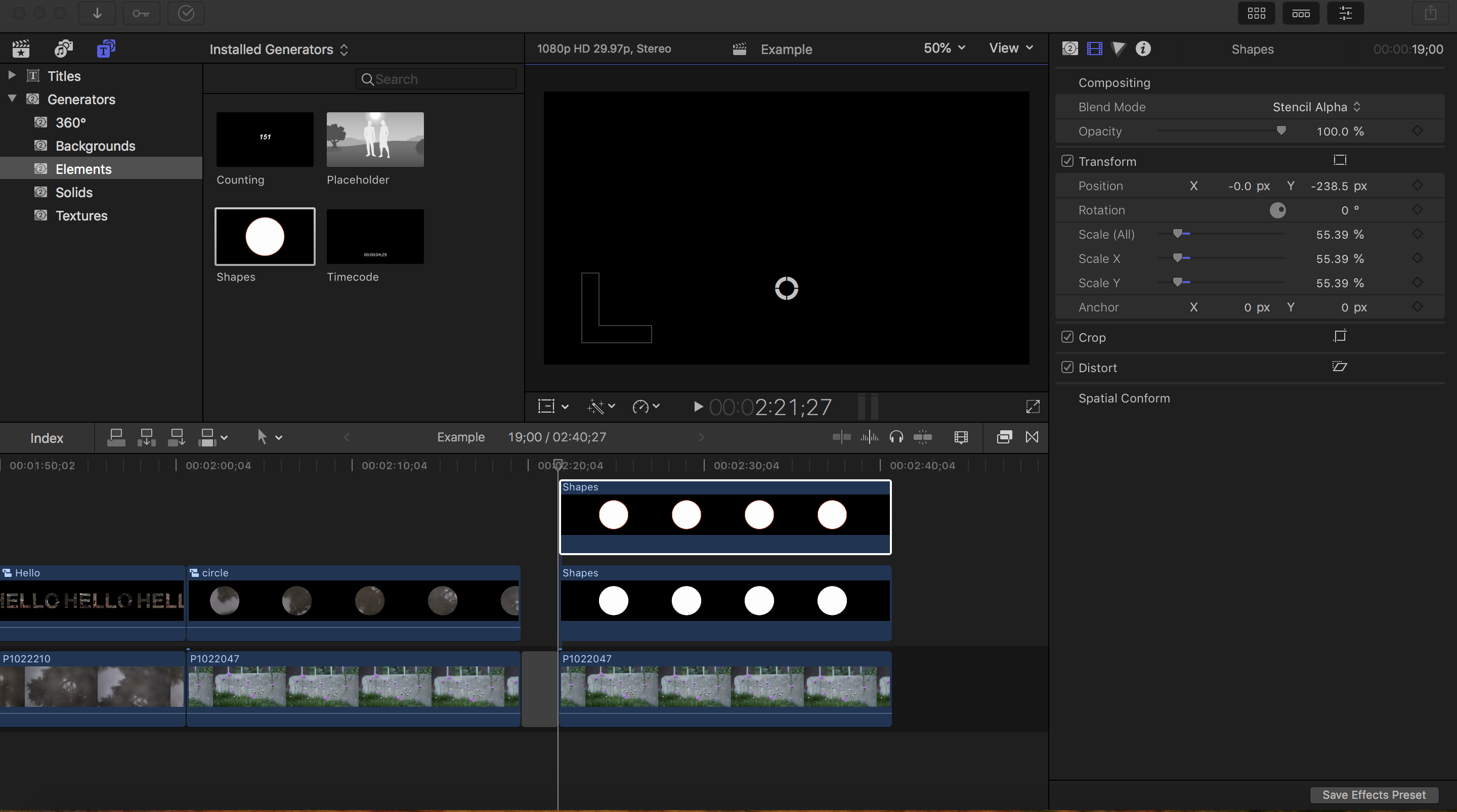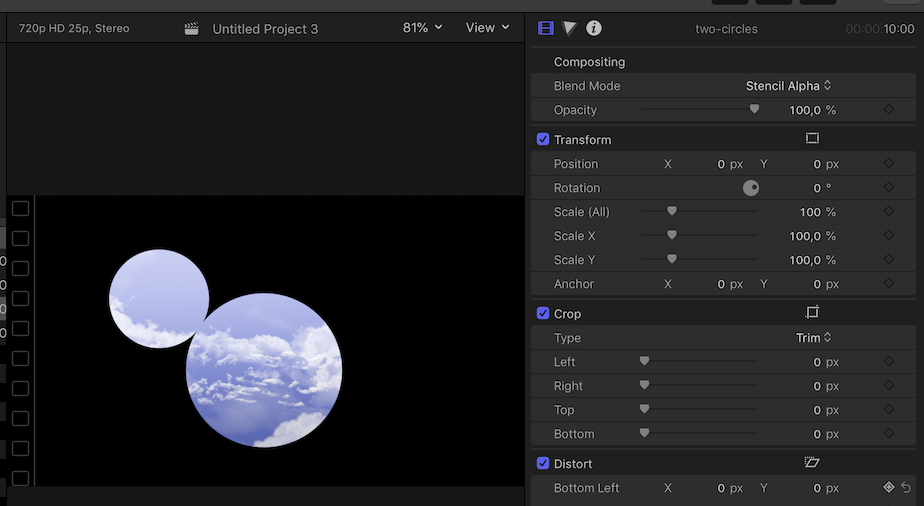 Below is a file in Pixelmator with two white circles, one transparent circle and a black background. If put above a video in FCP X, only the part of the video under the transparent circle will show.