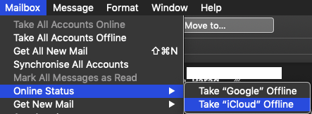 Apple mail automatically saves to iCloud. Is there a way to control that? Also, my Mailbox menu does not have a choice of checking online status. I only have Take All Accounts Offline.