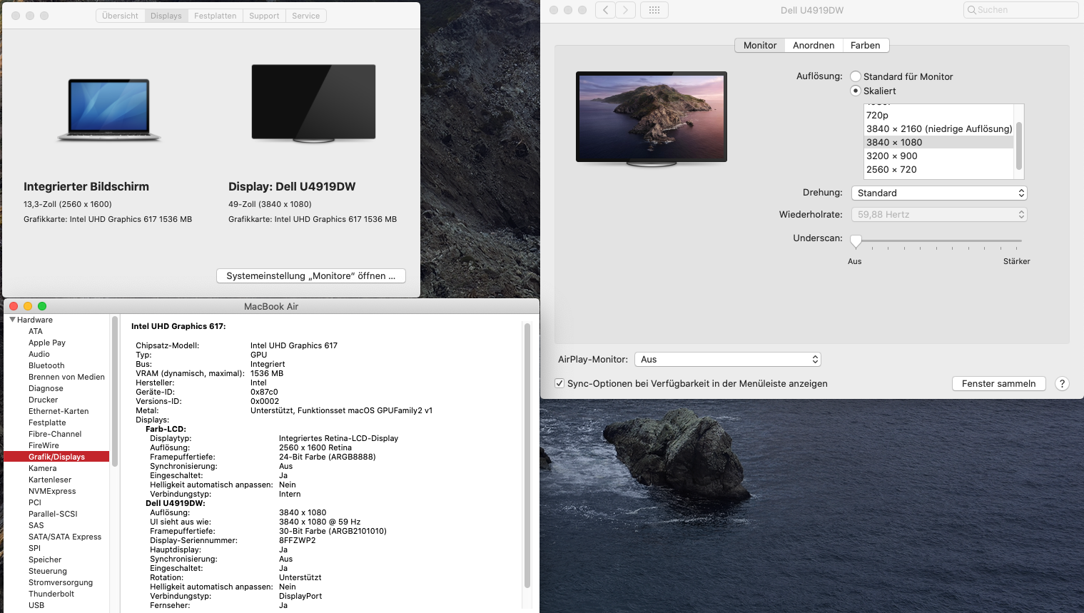 I have just purchased the Dell U4919DW monitor to use with my early 2018 MacBook Pro 13", but unfortunately I cannot choose full resolution 5120x1440 in the settings, max is 3840x1080. I have tried the app SwitchResX to manually set the 5k resolution without luck, only scaled.