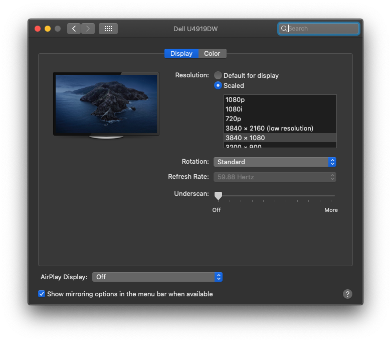 I have just purchased the Dell U4919DW monitor to use with my early 2018 MacBook Pro 13", but unfortunately I cannot choose full resolution 5120x1440 in the settings, max is 3840x1080. I have tried the app SwitchResX to manually set the 5k resolution without luck, only scaled.