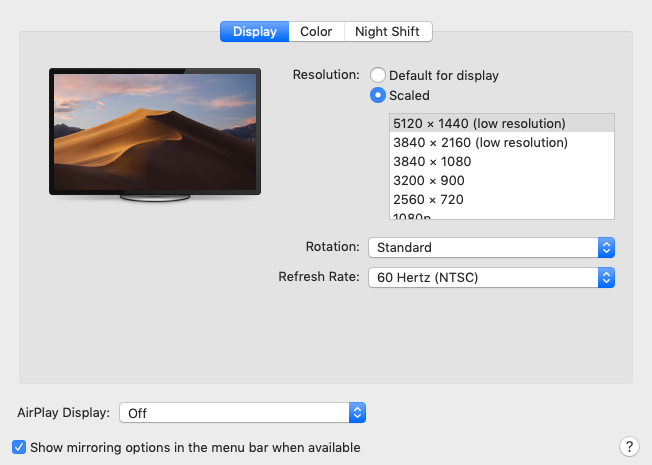 I have just purchased the Dell U4919DW monitor to use with my early 2018 MacBook Pro 13", but unfortunately I cannot choose full resolution 5120x1440 in the settings, max is 3840x1080. I have tried the app SwitchResX to manually set the 5k resolution without luck, only scaled.