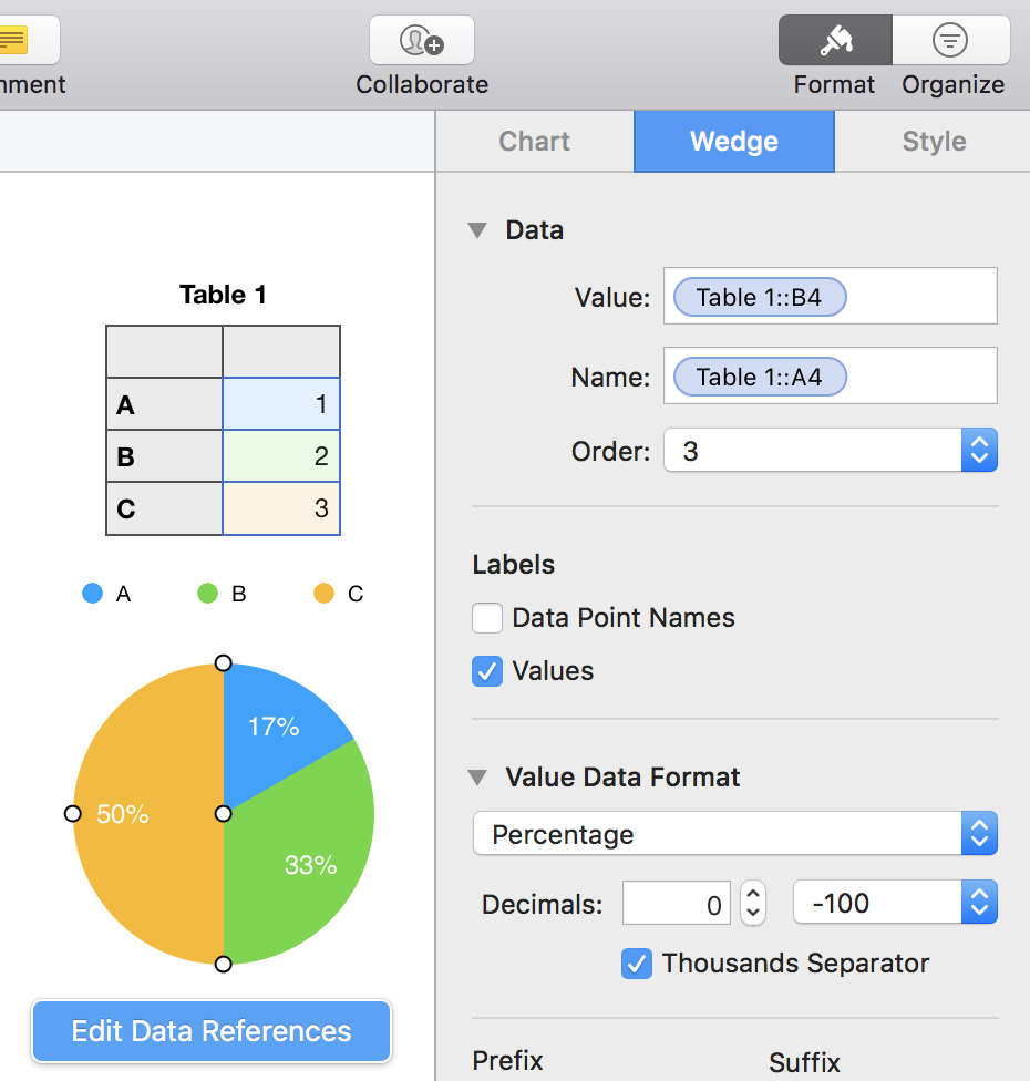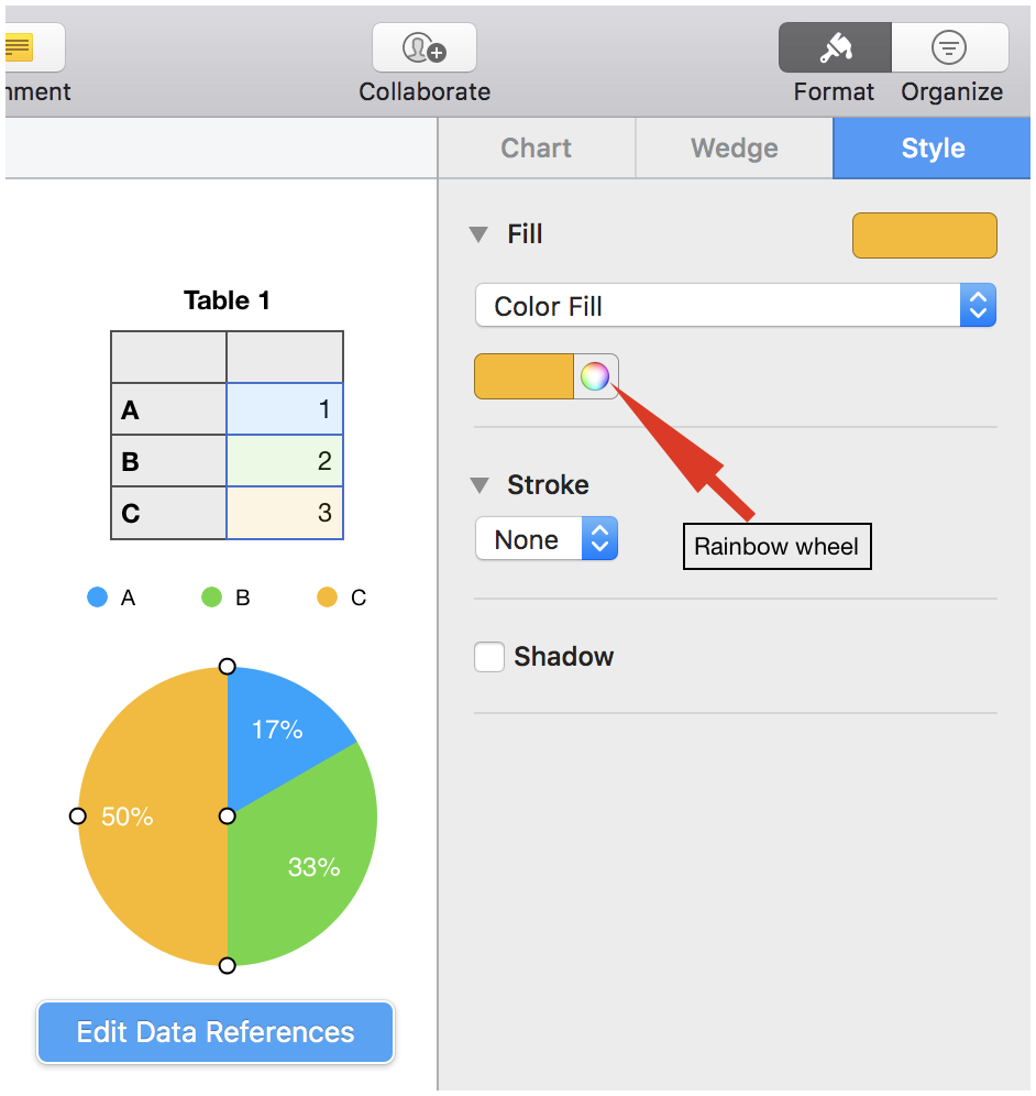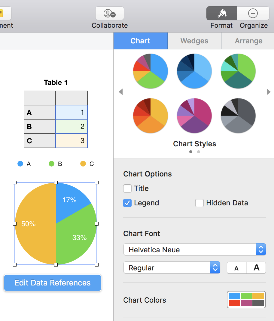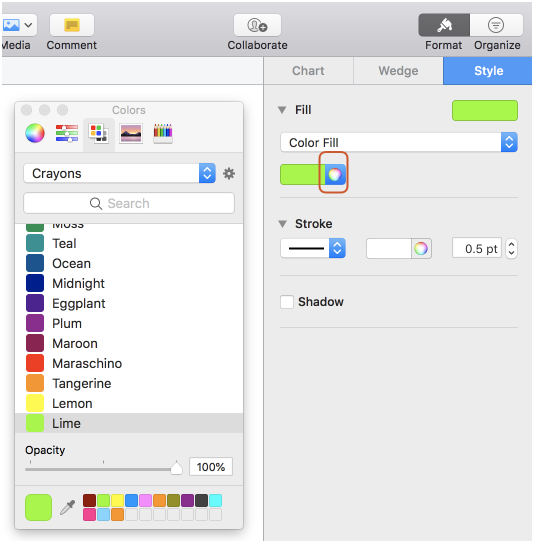 The pie chart for the monthly budget template in Numbers only has 6 different colours (and very similar ones). How do we modify some colours, or add colours if we have more than 6 categories?