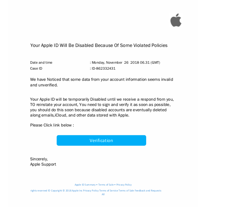 I received an email from the address "-***@appleid.com" in my junk mail box. Is this a fake apple support account?