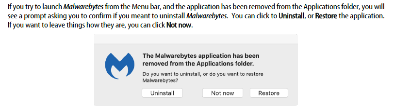 The documentation I noted according to this issue was not completely explained with a purposeful remedy in the past. As others have posted, I installed the original Malwarebytes program according to the recommendation of an Apple support tech rep. I removed the program in the past when I felt no use of it, but it remains that I have a Malwarebytes Agent as specified by my Activity monitor that uses 64 bits in my computer that remains to be unremovable. It cannot be removed from the Activity Monitor location for it seems to automatically change its location from this position and oddly seems to reinvent itself. Upon the recommendation of removing the icon that remains on the activity bar of my computer, pressing the command key and dragging it to trash does not work either. Its presence allows it to send me advertisements which are quite annoying. There is no other source that lists its presence in my computer that I have found from any recommendation. One recommendation is to install Malwarebytes again and have it installed, but I am concerned if this will actually uninstall the Malwarebytes Agent that should have already been uninstalled in the first place as it was removed before. I am simply not going to live with this. Malwarebytes.com does not offer any assistance in this matter to properly manage their own product. Will anybody please assist me with any advice on how to eliminate such garbage from my computer.