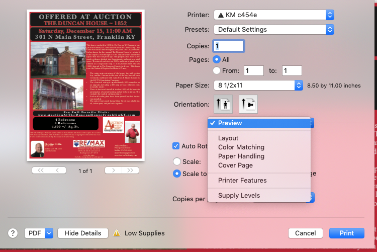 I updated to Mojave recently and cannot print from Preview to my office printer. I am using a Konica Minolta Bizhub C454e. I am able to print from Chrome and Excel and other programs, just not Preview. We use Account Track settings where everyone has their own code. Since updating to Mojave it does not give me the option to plug in the code when in Preview. Below is what it looked like before I updated to Mojave. I'd have the option to choose Output Method. Once in Output Method I could select Account Track and put in my copier code.
